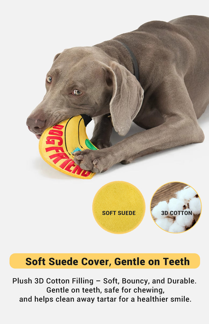 This stylish fruit-shaped flyer combines play and dental care in one! Made with premium suede fabric and exquisite embroidery, it's filled with soft 3D cotton that stays springy and keeps its shape through tough play. It's both a fun interactive frisbee for fetching and a satisfying chew toy that helps reduce plaque. The built-in squeaker adds excitement to every toss and chomp, perfect for burning energy and strengthening your bond.